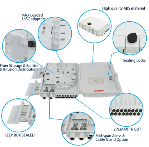 Kotak distribusi terminal luar ruangan, pemisah optik serat terpasang di dinding, 16 produk kustom ftth, kotak pemisah 24 inti
